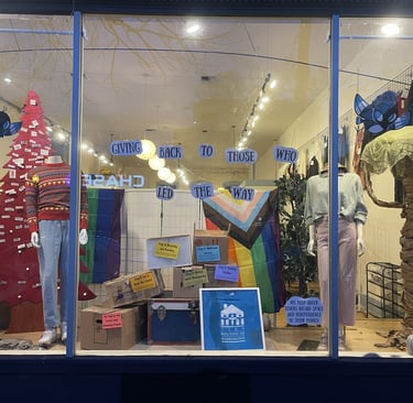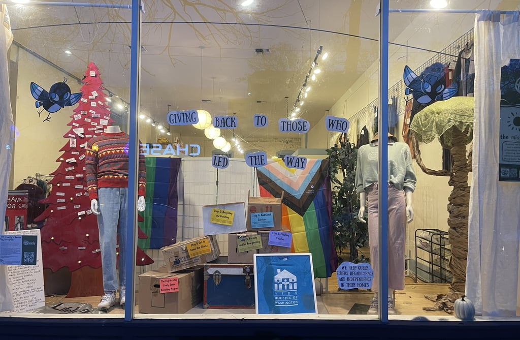 In the center of the window, above the movie boxes, is the phrase, "Giving back to those who led the way." Our senior program aims to help primarily Queer elders receive support through challenging transitional phases in their life. Often LGBTQ folks might not have the biological family to call for support as they age, as our history is deeply tied to Seattle Queer community, it's only right that we give back to the folks who made our city what it is today.